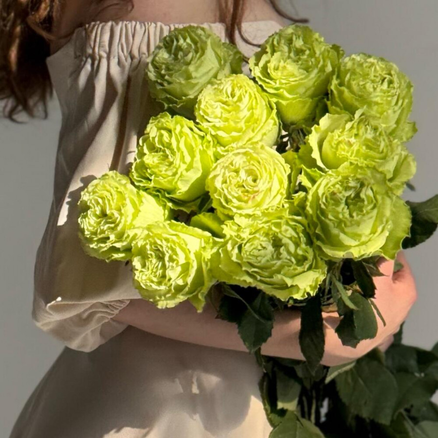 На фото букет из 11 зеленых роз. В составе: пионовидная роза 11 шт, атласная лента 1 шт, . Все цветы свежие и ароматные, букет красиво оформлен и отлично подходит для подарка. Доступна доставка цветов или самовывоз.