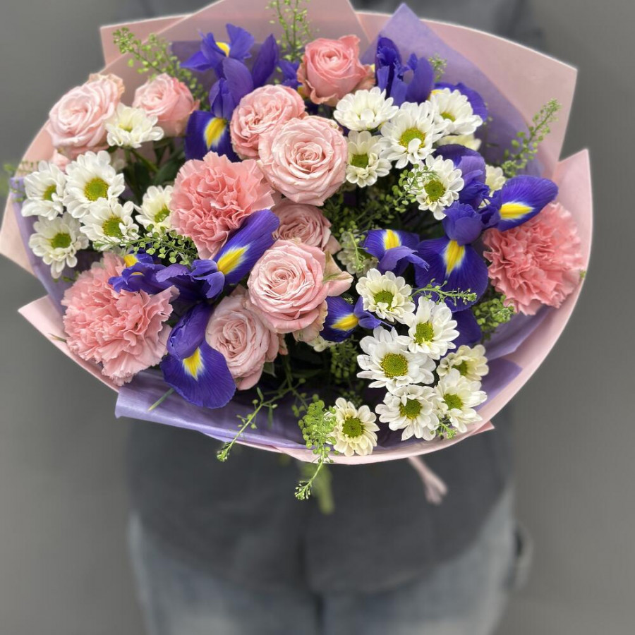 На фото букет «розовый блюз». В составе: кустовая роза 3 шт, гвоздика 3 шт, хризантема кустовая 3 шт, ирис 5 шт, дизайнерская упаковка 1 шт, атласная лента 1 шт, . Все цветы свежие и ароматные, букет красиво оформлен и отлично подходит для подарка. Доступна доставка цветов или самовывоз.